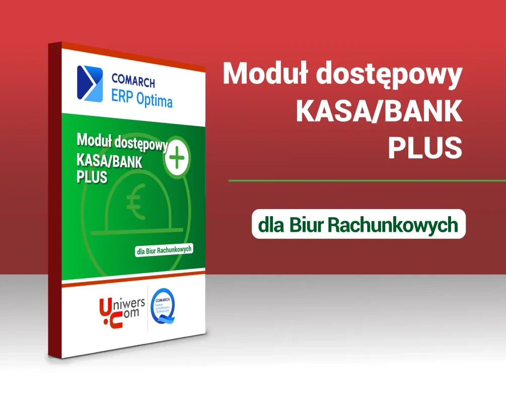 - Moduł Comarch ERP Optima Kasa/Bank wersja plus posiada funkcjonalność modułu kasa bank i jest wzbogacony o dodatkowe funkcjonalności.